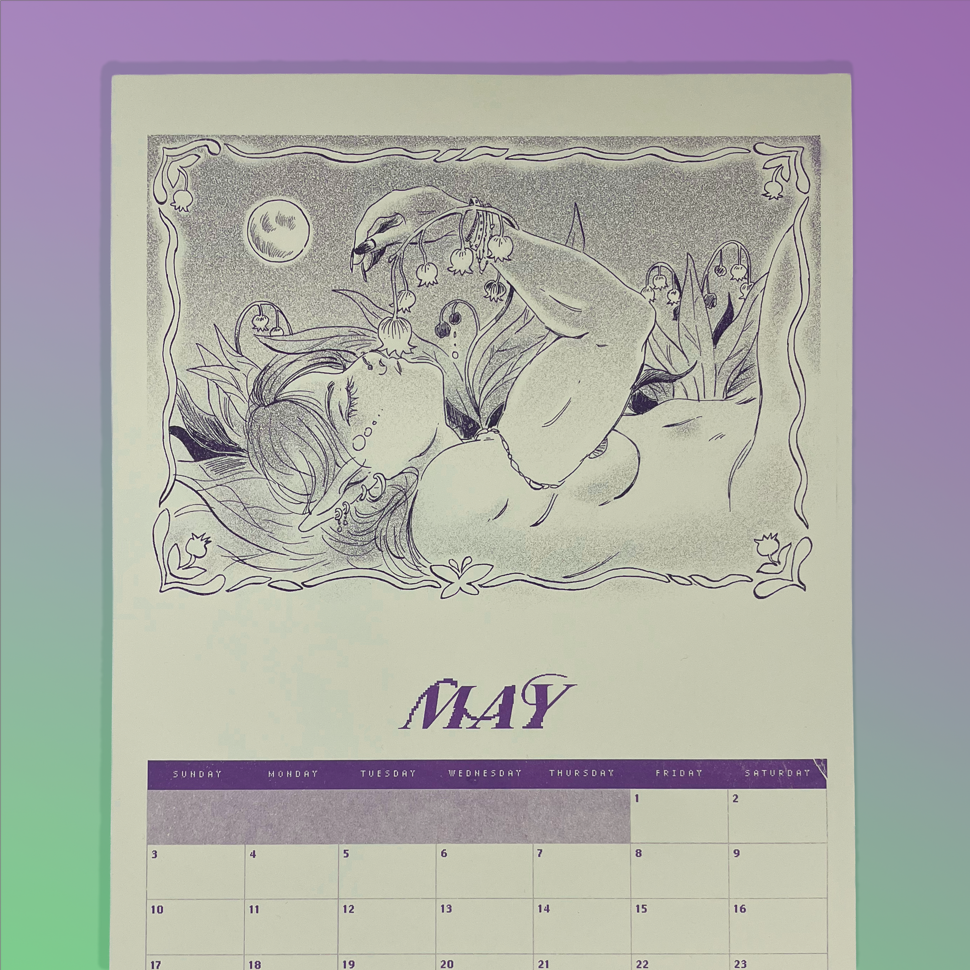 Calendar will be riso printed in Orchid, Purple, Blue, and Cornflower on natural stock. Saddle stiched with a hole for wall-hanging.