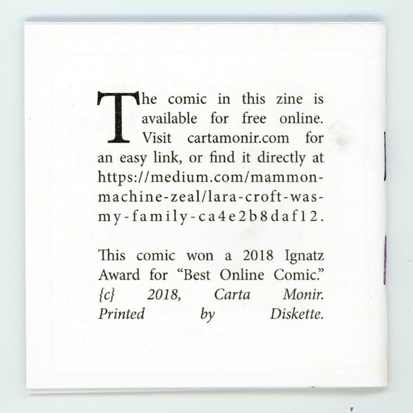Only recently rediscovered after a studio move, these are the final physical copies of Carta Monir's award-winning 2017 comic, Lara Croft Is My Family. Originally drawn for ZEAL, this comic is a painful and intimate glance into Carta Monir's family dynamics through the lens of the Tomb Raider series of PC games.