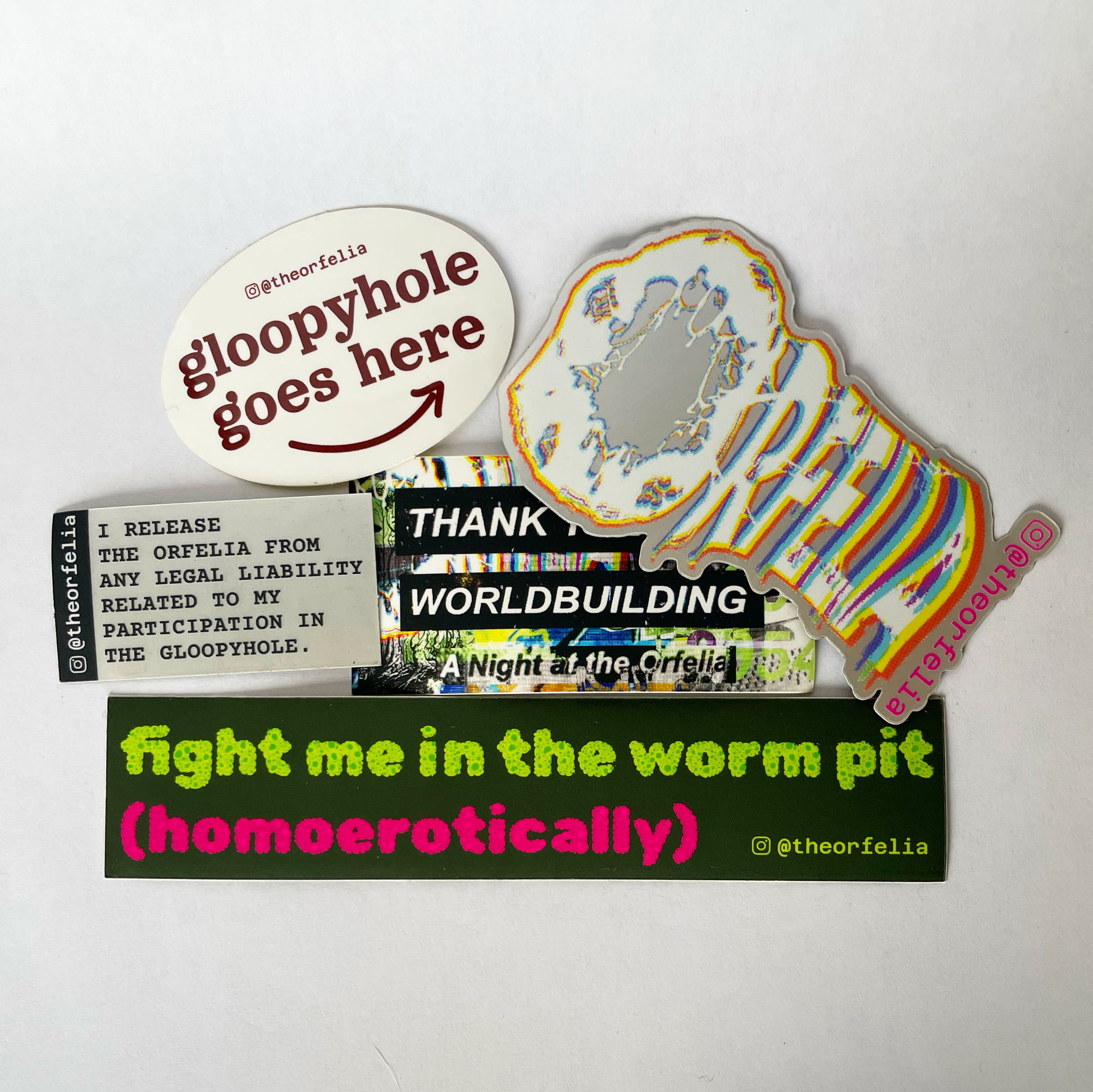 It’s 30 years from now–we’ve finally rid ourselves of billionaires, hunger, and housing insecurity. In between actually living a life of meaning, purpose, and fulfillment, you find yourself at The Orfelia, the messy and chaotic queer nightclub where the utopia is still being created. A Night At The Orfelia is an interactive installation exploring what the future may hold by imagining joyful and enthusiastically utopian visions that lie just outside of our reach. Grab a pack of stickers to decorate your utopia!